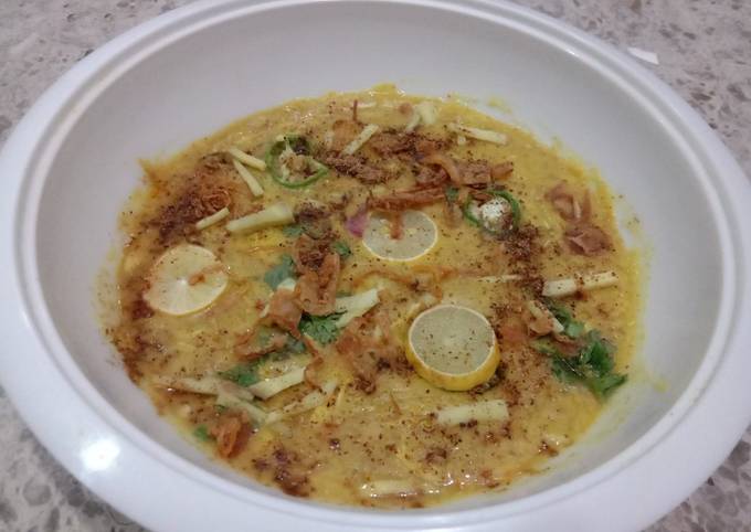 - Sab dalo ko aur gaheo aur rice ko 5 hours bhigo dae phr 1 bry pately mein 4,5 littre water boil karein aur sub dalo aur gaheo aur rice ko slow flame par salt aur haldi dal ke 3,4 hours ke liy cook kar ke soft kar lae phr daal ko ghonnt lae takh paste ban jay.