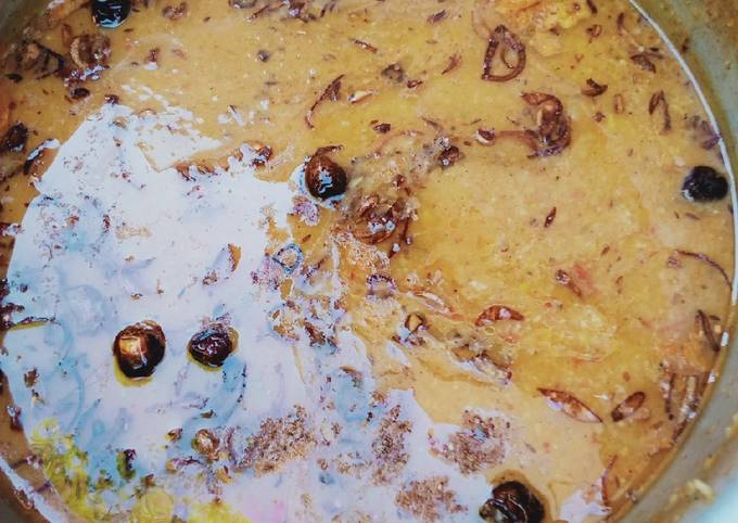 - Rice or sari dalon ko bhigo k rakh Dyn 1 hour k liye or 1 pan mein 4 tbs oil Dal k dalya bhoon Lyn Jab tak Achi c khushbo a jaye.